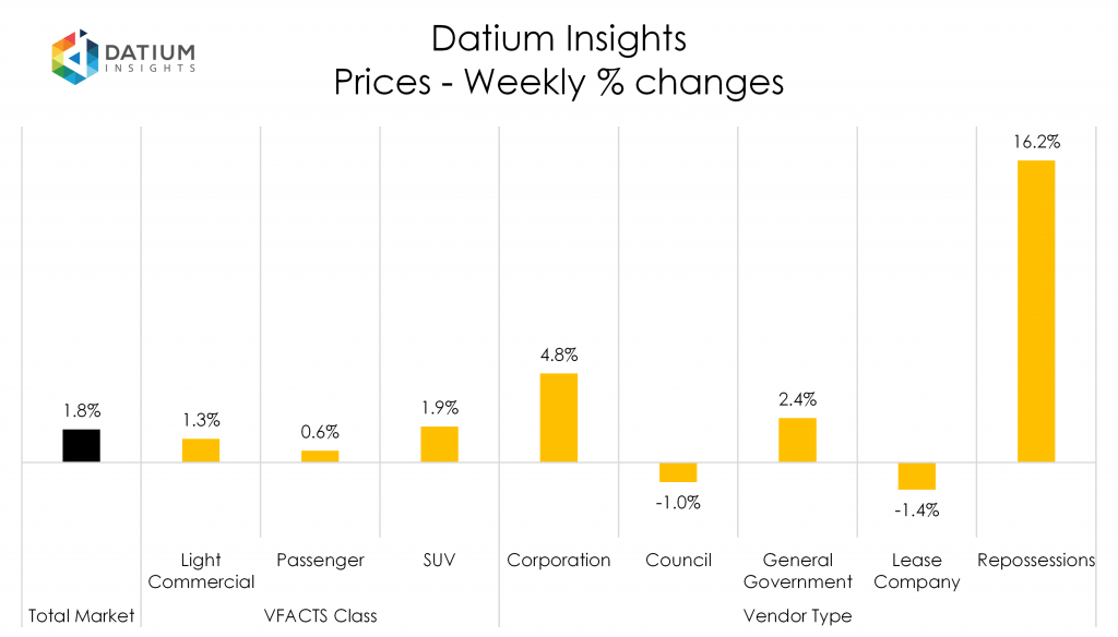 - Prices were up the past week (+1.8%) with repossessed vehicles (+16.2%) seeing the largest increase
