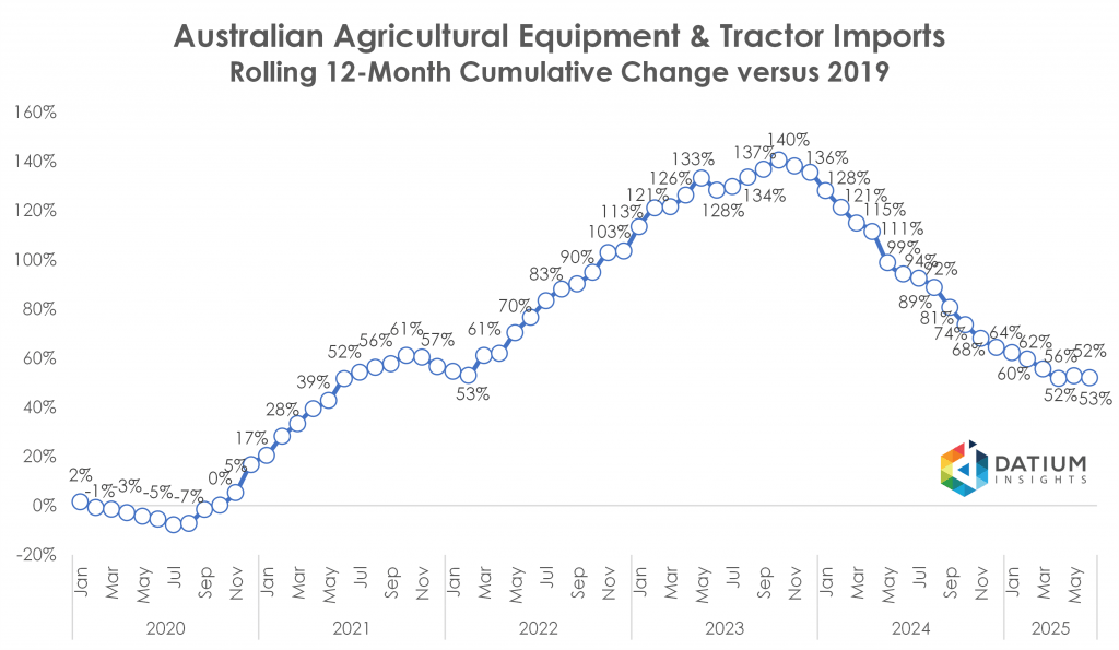 - The rolling 12 month change shows imports are up 52% in June 2025 compared to 2019, indicating a downward trend