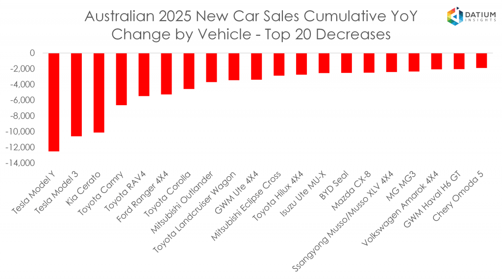 The bottom 5 models with the greatest decreases so far in 2025 are: