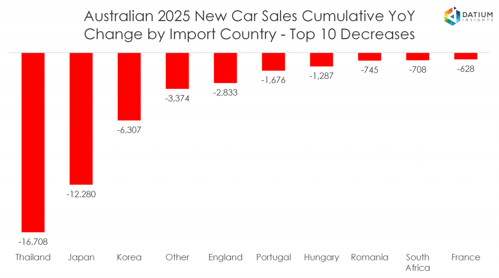 • Sales of imported vehicles from Thailand seeing the largest decrease of 16,708 units compared to 2024
