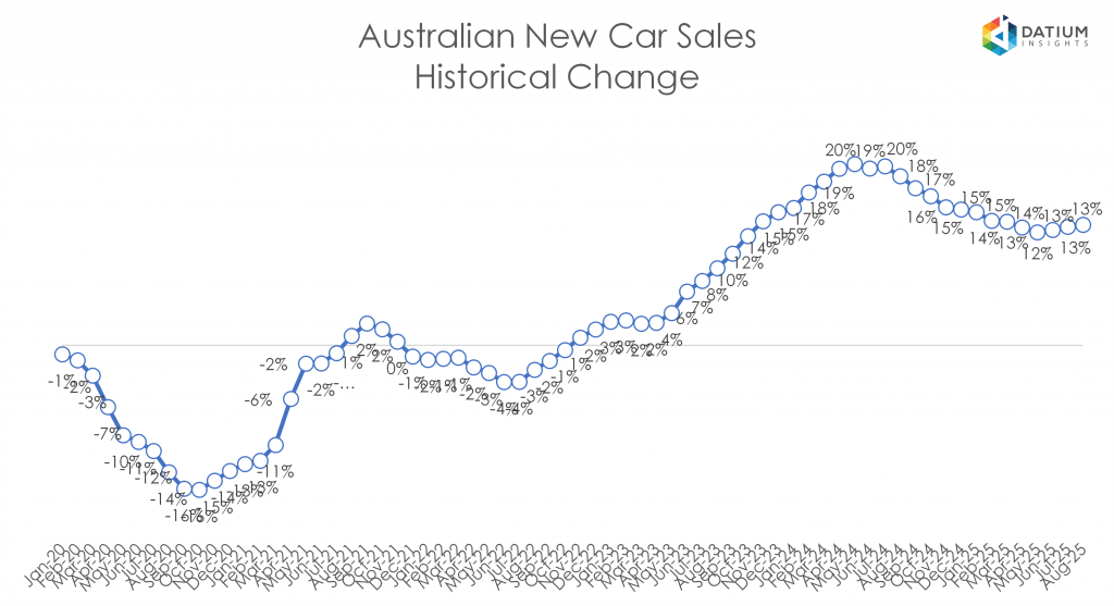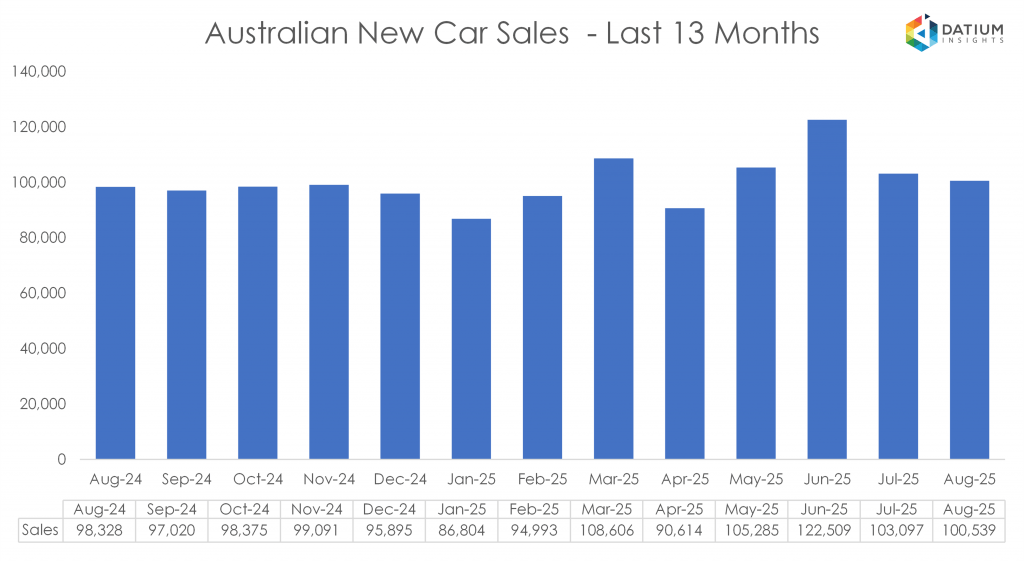 • August 2025 recorded 100,539 new car sales in Australia, as reported by VFACTS.