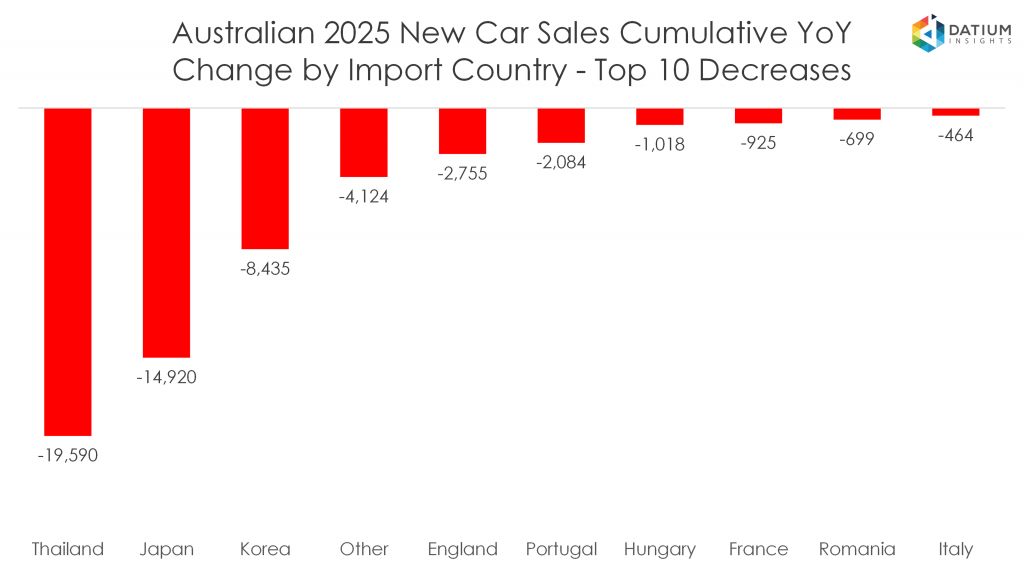 - Sales of imported vehicles from Thailand seeing the largest decrease of 19,590 units compared to 2024