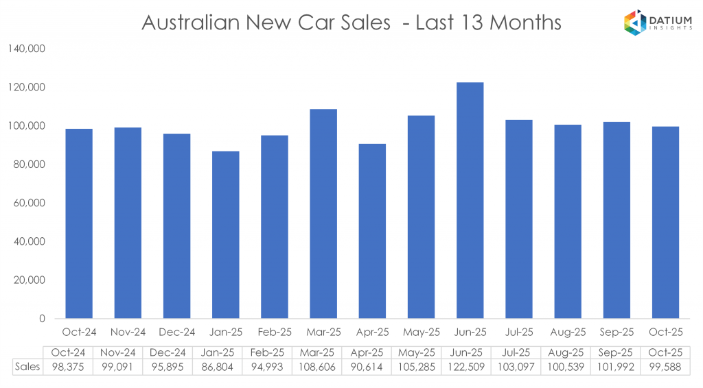 - October 2025 recorded 99,588 new car sales in Australia, as reported by VFACTS.