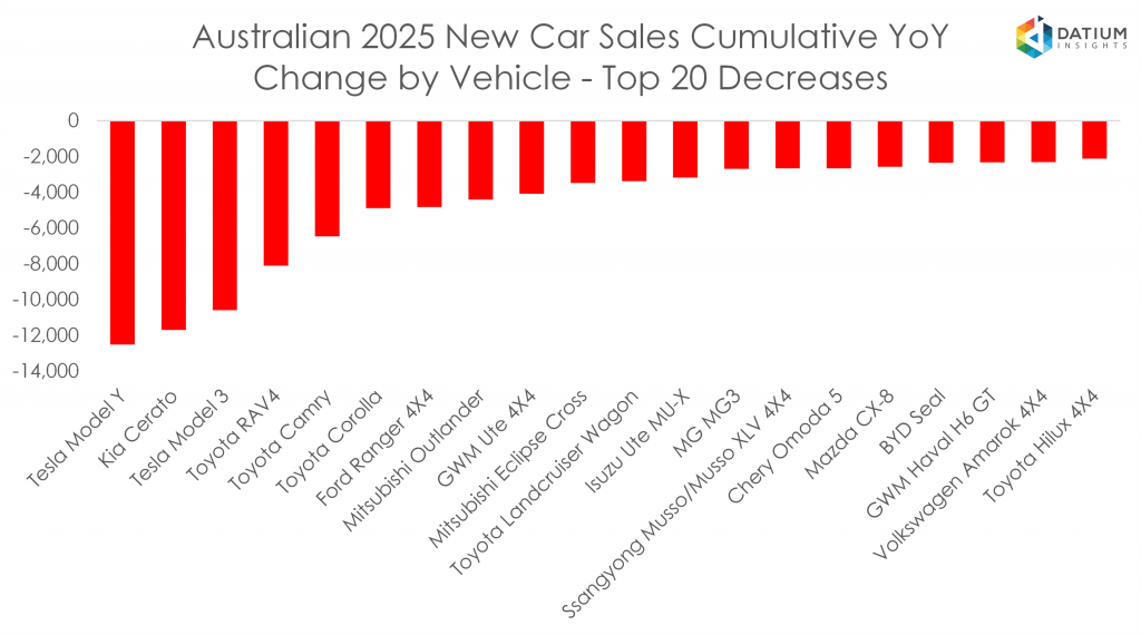 The bottom 5 models with the greatest decreases so far in 2025 are: