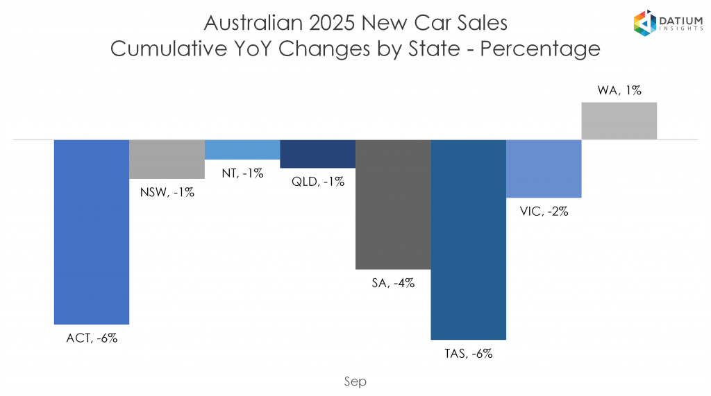 - Sales fell across most states, with the TAS experiencing the largest drop at -6% YoY.