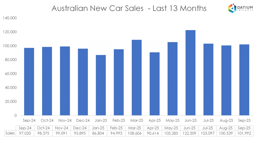 - September 2025 recorded 101,992 new car sales in Australia, as reported by VFACTS.